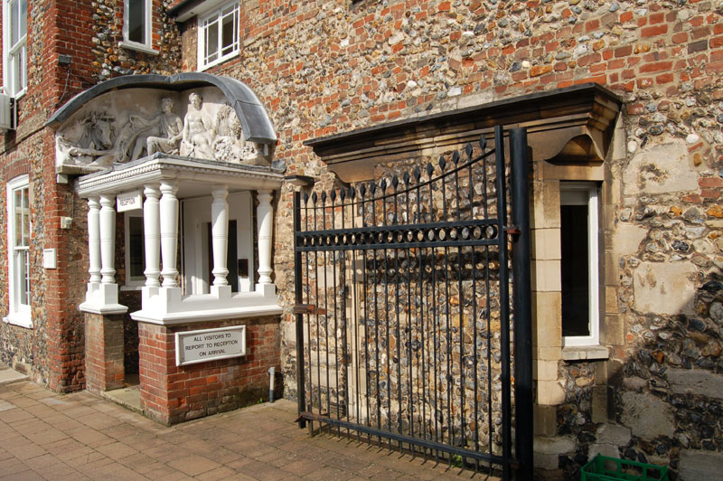 Carter's Builders Entrance, believed erected by Lot Jackaman the builder from original mouldings for the Corn Exchange. C 1861. Lead roofing by R G Carter, late 1990's |