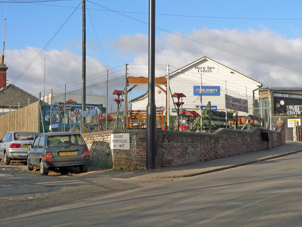 The same view - Bury Tyre Centre in 2006 The Tyre Centre building is original from 1872. The old offices with the plaque are just visible on the left of the picture. Rollerbury is visible on the right. (Originally built for BR as a goods depot.) |