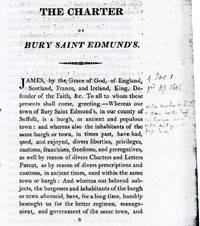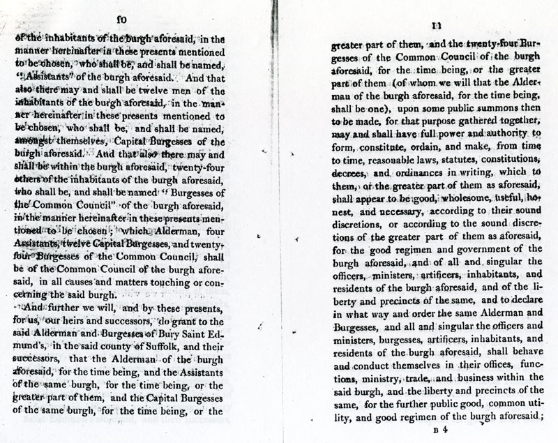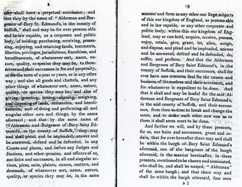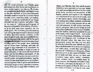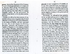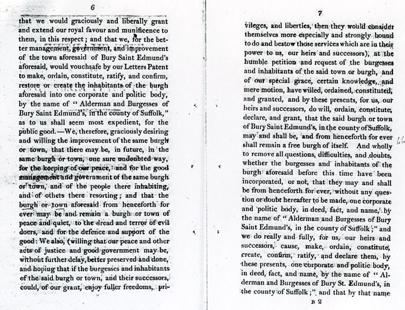 6 and 7 These latters patent make the inhabitants into one corporate body, "The Alderman and Burgesses of Bury Saint Edmunds".. |