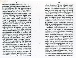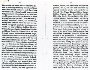 Pages 16 and 17 Twenty four Burgesses appointed for life. Defines power to remove members for bad management or ill conduct. Annual election of Alderman from Capital Burgesses. |