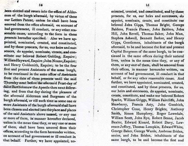 14 and 15 Appoints the Alderman and four Assistants, pending due election. Twelve named Capital Burgesses appointed for life. |