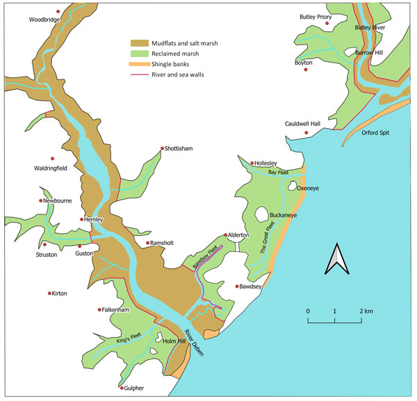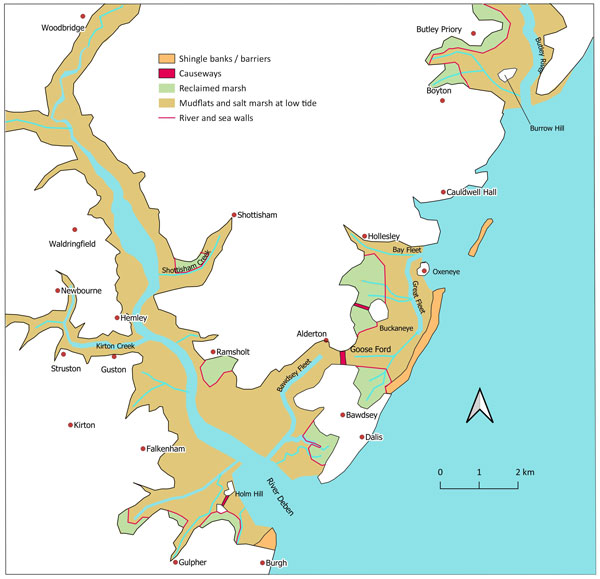 The The River Deben and the coastline by around 1600. This is Figure 31 in the SIAH article. While deposition has encouraged further land reclamation, Bawdsey Cliffs have experienced erosion. Goseford port is now associated with the Deben and Bawdsey Fleet area as Oxeneye has become cut off from the sea. |
