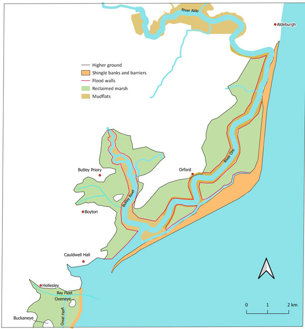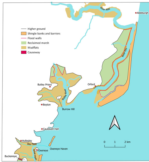 Orford Ness seen in about 1170. This is Figure 29 in the SIAH article. Even at this early date river walls had been established in places to allow some reclamation. Hollesley is still a port at this time. |