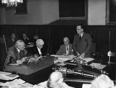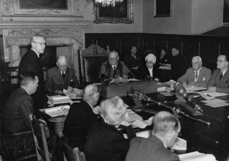 Alderman R A C Olle, Chairman of the Watch Committee asserts that shopkeepers had an ancient right to set up a stall in the Market place. The Town Clerk believed that the Council had over riding authority over the issue. Alderman W T Porter, JP, sitting adjacent. |