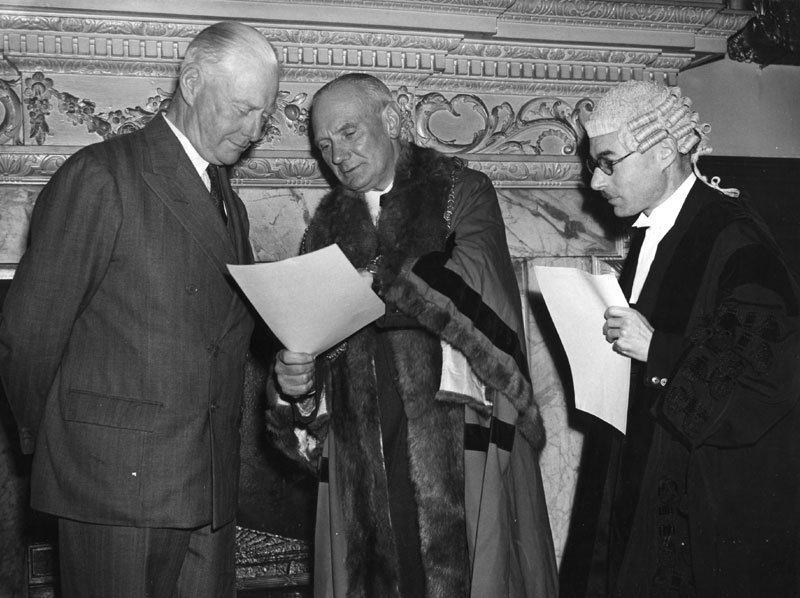 The Mayor, Alderman E J Sewell and Sword Bearer Mr R D Dorling Robing the Mayor before the meeting. Mr Dorling had 21 years service with the corporation following 21 years in the Royal Dragoons. |