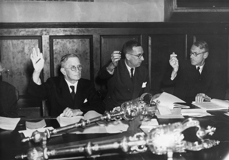 Cllr E W Steward, JP, Alderman G H Pemberton, (Chairman of Highways Committee), Alderman F T Bright, (Chairman of Finance Committee) Voting on an amendment to refer back the recommendation that shops in the Market Place lose their privilege of a stall on their frontage on market days. The amendment was defeated by 11 to 10. |