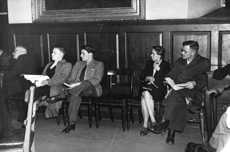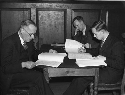 Mr H G Maltby, curator of Moyses Hall Museum, Mr R J Pitcher, Borough Treasurer, and a work experience law student, taking notes of the meeting. |