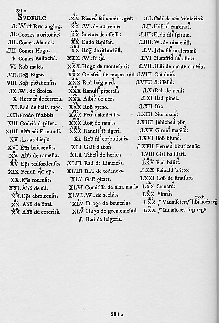"Then at Christmas the king was at Gloucester with the council and held his court there for five days, and then the archbishop and clerics had a synod for three days. There Maurice was elected Bishop Of London, and William for Norfolk, and Robert for Cheshire: they were all clerics of the king. After this the king had much thought and very deep discussion [mycel geðeaht and swiðe deope spæce] with his council about this country — how it was occupied and with what sort of people. Then he sent his men over all England into every shire and had them find out how many hundred hides there were in the shire or what land and cattle the king himself in the country, or what dues he ought to have in twelve months from the shire. Also he had a record made of how much land the archbishops had, and his bishops and his abbots and his earls — and though I relate it at too great length — what or how much everybody had who was occupying land in England, in land and cattle and how much money it was worth. So very narrowly did he have it investigated, that there was no single hide nor virgate of land, nor indeed (it is a shame to relate though it seemed to him no shame to do) one ox nor one cow nor one pig which was there left out, and not put down in his record [on his gewrite]; and all these records were brought to him afterwards."