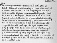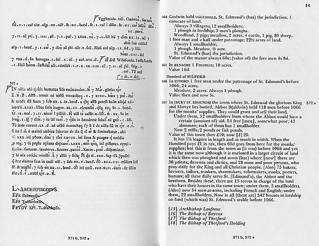 It has 1½ leagues in length and as much in width. When the Hundred pays £1 in tax, then 60d goes from here for the monks' supplies; but this is from the town as it was before 1066 and yet it is the same now although it is enclosed in a larger circuit of land which then was ploughed and sown but where now there are 30 priests, deacons and clerics, and 28 nuns and poor persons, who pray daily for the King and all Christian people. Also 75 bakers, brewers, tailors, washers, shoemakers, robemakers, cooks, porters, bursars; all these daily serve St Edmund's, the Abbot and the brethren. Besides these, there are 13 reeves in charge of the land who have their houses in the same town;