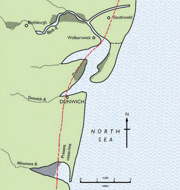This map comes from the booklet "Southwold's Changing Fortunes". It shows a different view of the coastline around 1066 and demonstrates how the town of Dunwich commanded the entrance to the River Blyth at this time. From 1230 to 1408 Dunwich had charter powers to levy tolls on cargo ships passing upriver to Walberswick and Southwold. By about 1500 the shingle banks had extended and closed off the entrance to Dunwich and the people of Walberswick and Southwold had breached the shingle bank to drain the Blyth between those two towns. |