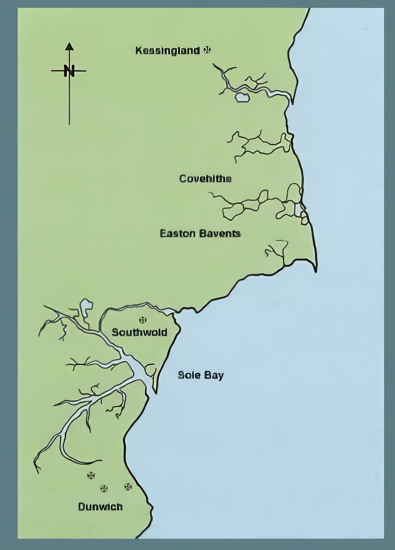 This map from the Southwold Museum's online resources shows the Sole Bay as it might have looked in the 11th Century. The Museum comments that "Sole Bay really was a bay set between the twin promontaries of Easton Bavents and Dunwich." |
