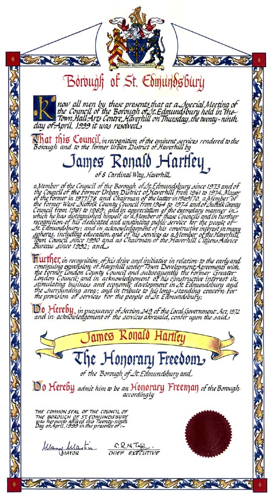 ![]() The official Freedom of the Borough Scroll presented to James Ronald Hartley Click here for a larger image |