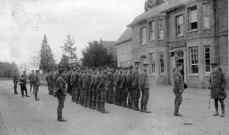 There were many more units than just the Suffolk Regiment billetted around Bury St Edmunds. The Royal Engineers camped at Fornham St Martin in 1914. Here they are on parade outside the Woolpack inn. Photo by Walton Burrell of Fornham St Martin. Burrell would photograph many of the units and the injured in hospitals in the area.