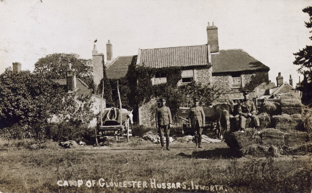 Units of many branches of the armed forces had to camp around Bury St Edmunds, By no means was the area restricted to the Suffolk Regiment. Here we see members of the Gloucester Hussars encamped at Ixworth. Mr Lonnon, a chemist and photographer in Ixworth, photographed the camp and sold the pictures as postcards, to the troops. The Ixworth village website states that, "The Gloucester Yeomanry were a volunteer cavalry unit and along with others from counties nationwide they were the fore-runners of the Territorial Army. When war with Germany was declared on 4 August 1914 action was taken immediately to provide home defence. To guard against the possibility of an invasion troops were moved towards the east coast." Ixworth received squadron D, while A went to Great Barton Manor and B to Pakenham. They were in Ixworth for only 15 days in August 1914. A year later those who volunteered for overseas service were landing at Gallipoli.