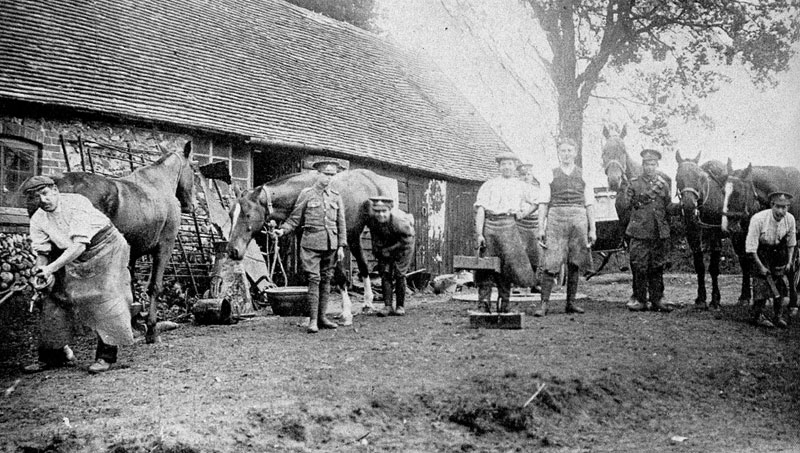 Although the Great War ended as a mechanised conflict, it started based around horsepower. This view of Samuel Gathercole's Livermere forge shows horses taken into military control for use in the war. They are being shod.