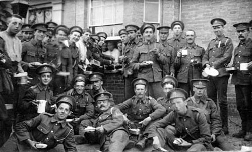 This picture is dated 20th May 1916 and shows soldiers of the Norfolk Regiment having dinner near the parish church of Fornham St Martin. |