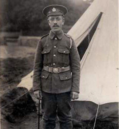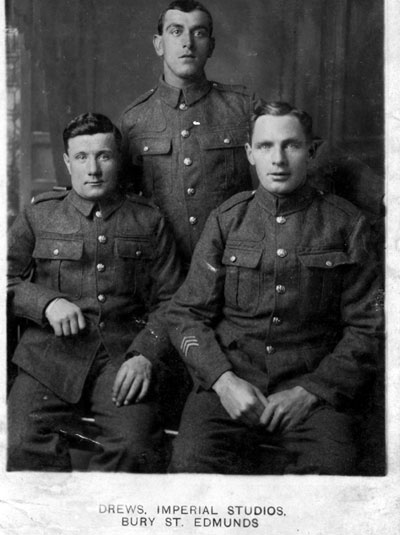Individual soldiers are not always identified in these postcards. However, this is R Barkham 415 Lowland Field Company Royal Engineers. He has written on the reverse " Yours Truly Robt. Barkham ". He enlisted on 18.3.1915 and served with the 2/1st London Field Company, Royal Engineers. Posted to France on 23.2.1916 and was at some point attached to the 415th Lowland Field Company, Royal Engineers. His address on discharge was 45 Edinburgh St, Swindon. Birth records suggest he was born in Bury St Edmunds and registered Dec 1881? and married in 1902. Photo by W.R. Burrell, Fornham St Martin, Suffolk. |