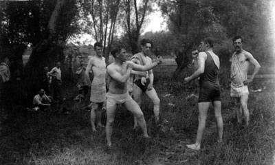 This picture of a boxing pose is just before or after a bathe in the river. It is W R Burrell negative 1319. |