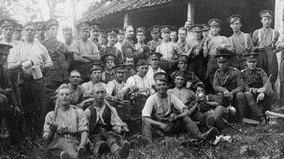 This card was posted in Bury St Edmunds in February, 1915. "Just a small group of the Squadron. Smith and I are crossed. Hope you are all well. Kindest regards, K.R." The unit is unidentified at present, but could be Yeomanry. (The Yeomanry were initially cavalrymen, and were divided into squadrons long before the air force existed.) |