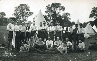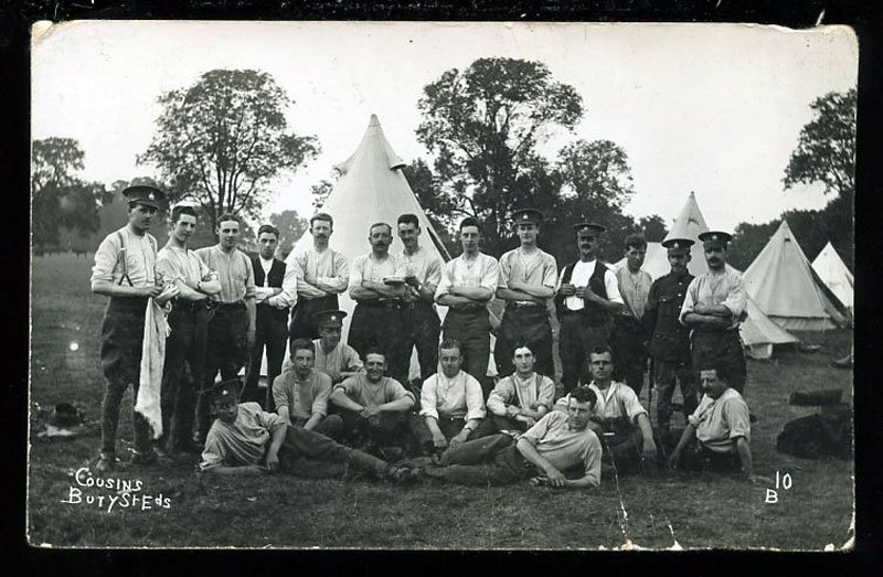 However, after signing on at the Gibralter Barracks, there were too many men to be accomodated there. Many units had to live under canvas during training. Here we see soldiers under canvas, photographed by Cousins of Bury St Edmunds. Cousins postcards are distinguished by being a bit sharper than other photographers can manage. |