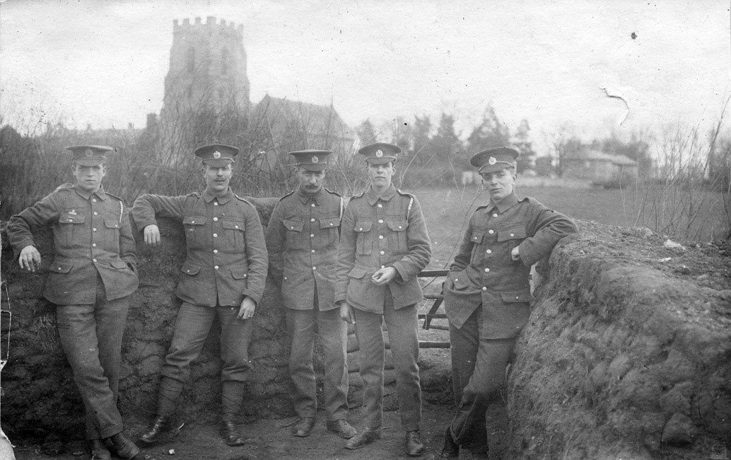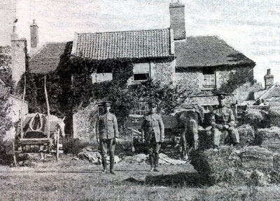 Five soldiers appear to be at a gate, but they seem to be standing in a construction of sandbags. Fornham St Martin church is clearly visible in the background. |