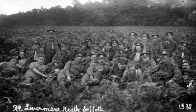 This picture, labelled "R.F.A. (Northamptonshire), Livermere, Suffolk", by Suffolk Record Office, was the first of Walton Burrell's extensive series of pictures of soldiers during WWI. It is dated August, 1914, and so must have been taken within 3 weeks of war being declared. RFA stands for Royal Field Artillery. |