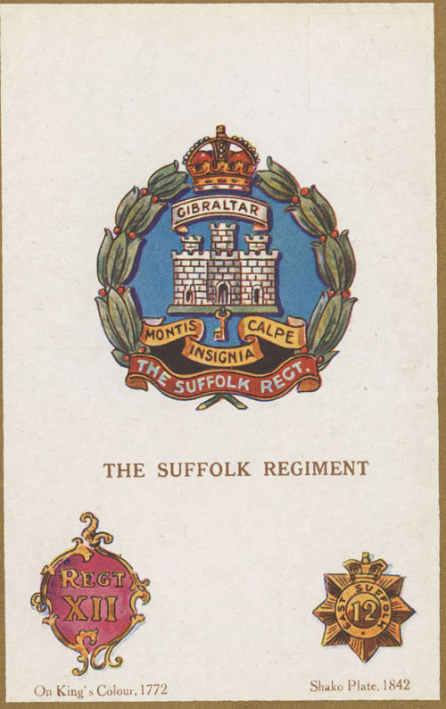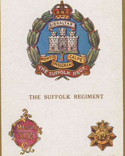Postcards of the insignia of army regiments were popular before the war. This one shows the badge of the Suffolk Regiment, formerly known as the 12th Regiment of Foot. This led to the regiment being nicknamed 'The Old Dozen'. |