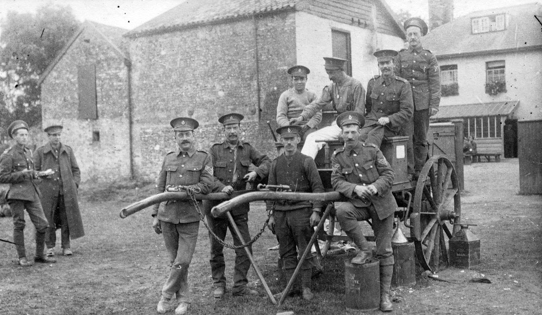 Dated to October, 1914, this picture from Suffolk Record Office is titled Field Kitchen at the Tollgate Inn. Ten soldiers with a waggon. The Tollgate Inn is only a few yards from the location of the encampments at Fornham St Martin. |