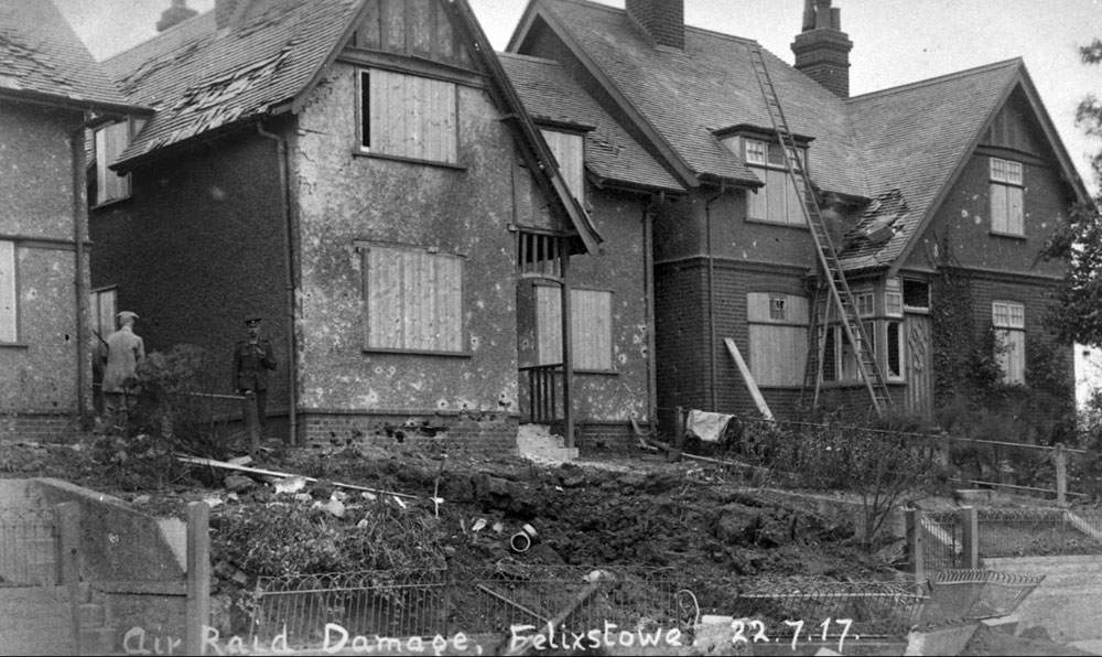 Felixstowe and Harwich was attacked by air on 22nd July, 1917. Fifty five bombs were dropped, but Harwich had no casualties. Felixstowe, however, suffered casualties and extensive damage.