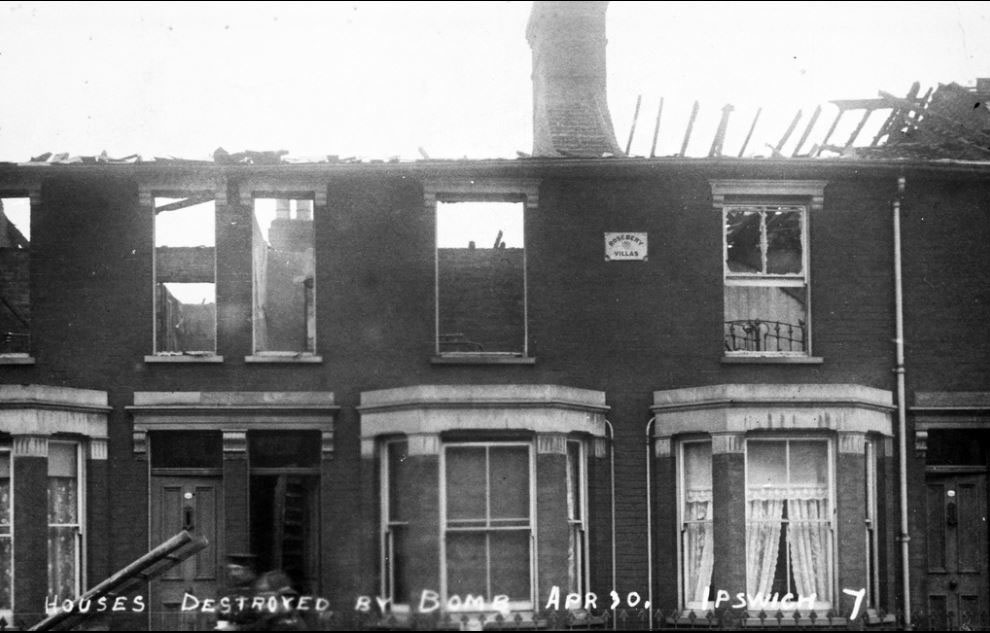 Ipswich was attacked by Zeppelin LZ38 on April 30th 1915 with two explosive and three incendiary bombs. Three houses were burnt out at Rosebery Villas, but residents escaped without injury. Theses addresses are believed to be numbered 56, 58 and 60 Rosebery Villas, Brooks Hall Road, Ipswich.