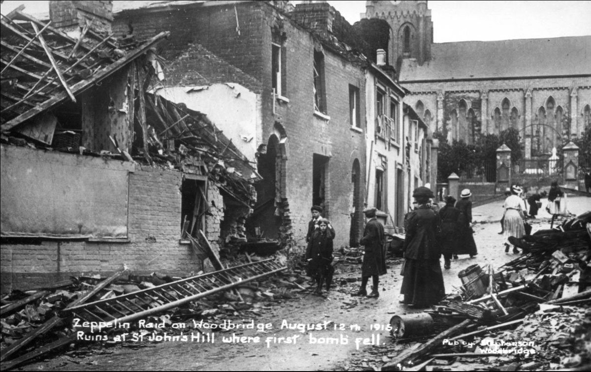 Woodbridge was hit by a Zeppelin attack on 12th August, 1915. Some 28 bombs were dropped by Zeppelin L10, and six people died. The main damage was around St John's Hill. Four airships had set out that night, but only two managed to attack England.