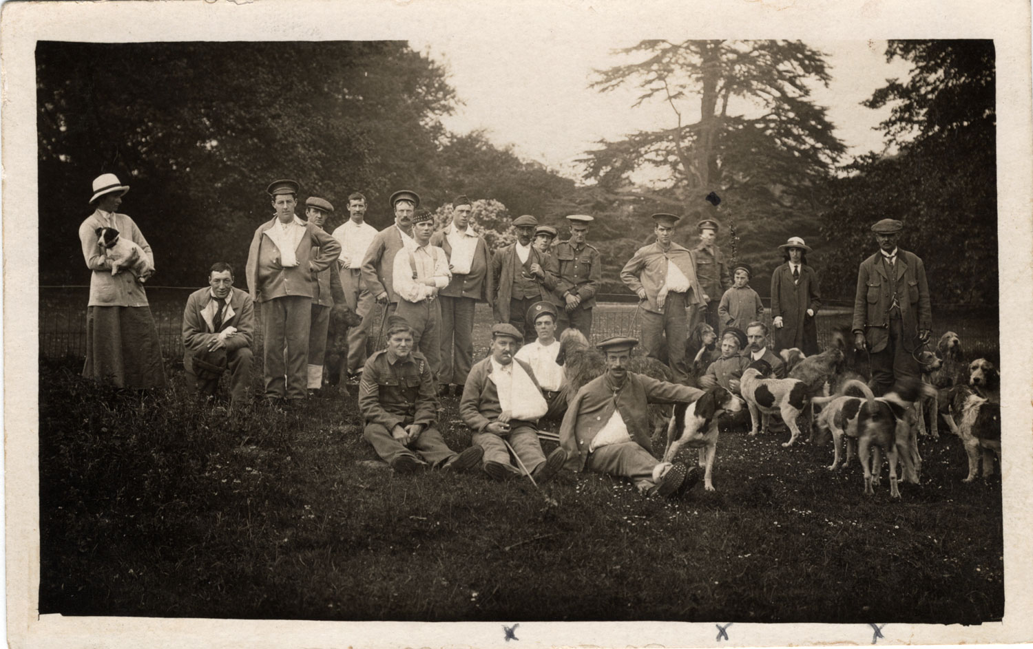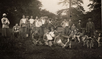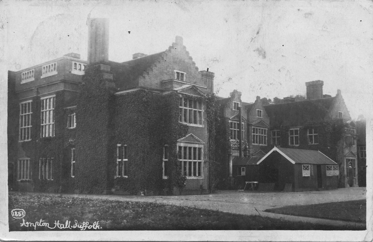 Hengrave Hall became a hospital for the wounded. This postcard shows recuperating wounded soldiers at Hengrave Hall near Bury St Edmunds, which was used extensively in WW1. They are in the company of some people apparently named on the rear of the card, along with the words "Otter Hunt". I think they read as Mrs Cartmell, G Mizen, Mr Paley, Mrs Price and family. The reverse is also stamped Photo : W R Burrell, Fornham St Martin, Suffolk, negative 1101.