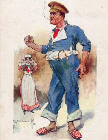 This comic postcard clearly shows the issues surrounding the uniform known as 'Hospital Blues'. Issued to men in hospital, the uniform was coloured blue, with a white lining, but had no pockets and was ill fitting. Hospital uniform included a red tie and a white shirt as shown here. |