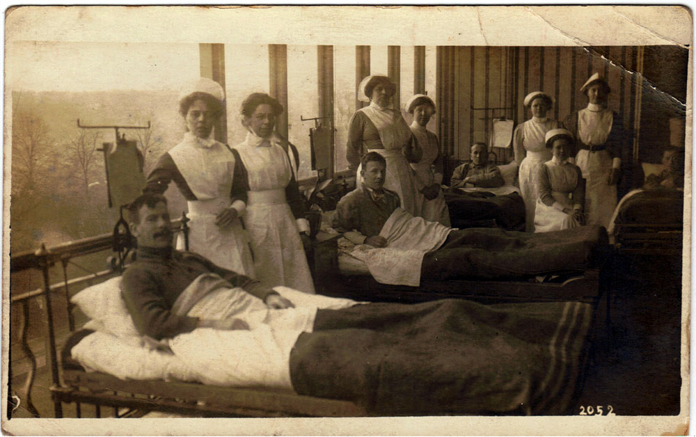 At first the normal hospital facilities took battle casualties. But there was soon an overwhelming need for more facilities and local mansions were requisitioned wholly, or in part, to be converted to hospitals. Picture in West Suffolk Hospital by Walton Burrell, negative 2052. (Gerald Brown collection.)