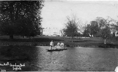 This picture shows five wounded soldiers enjoying a punt on the lake in Fornham Park, Suffolk. It bears the date 1st May 1916, and Fornham Hall is visible in background.