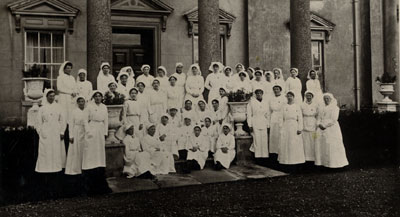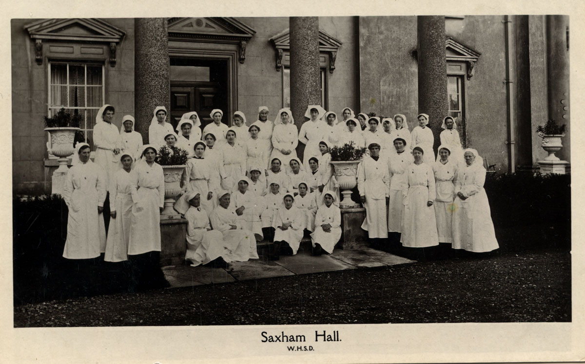 Great Saxham Hall was taken over for nursing purposes. Here we see some of the nurses at Saxham Hall on the front portico. |