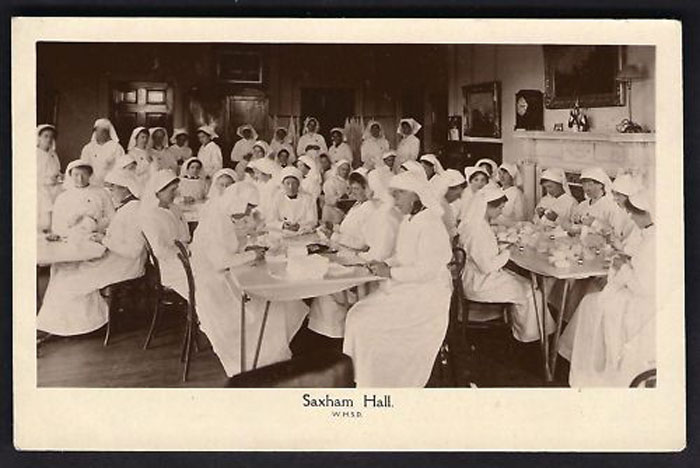 This postcard shows the nurses at Saxham Hall in their Dining Room. They are clearly wearing different uniforms to the VAD at Ampton Hall.