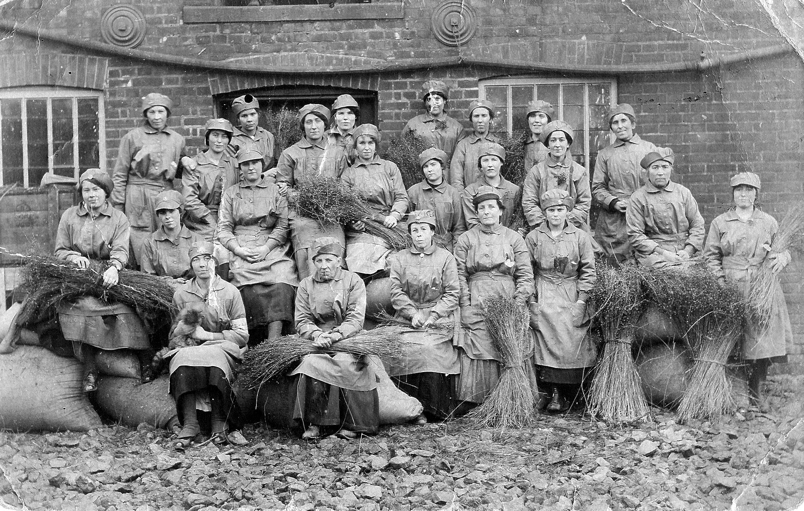 Glemsford flax factory producing linen yarn, 1916. Several war service badges and forage caps can also be seen in this picture, indicating that these were Women's Land Army volunteers. |