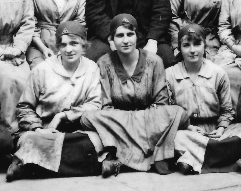 This is a close up of three of the young women working at T H Nice & Co making shells for the war effort. Women munitions workers were known as "Munitionettes". Many of the women were wearing their triangular 'On War Service' badges as seen here. This gave them a measure of public recognition, and in some cases reduced bus fares. (Martyn Taylor Collection)