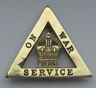 This picture shows the triangular 'On War Service' badge worn by munitionettes. According to the Imperial War Museum this triangular shaped badge was issued in May 1916 by the Ministry of Munitions. It was intended solely for women engaged in urgent war work. A clue to this fact is that the previous versions of the badge intended for men have a button hole fitting on the back. The 1916 triangular badge has a pin like a brooch for women. (Picture from Wikipedia) |