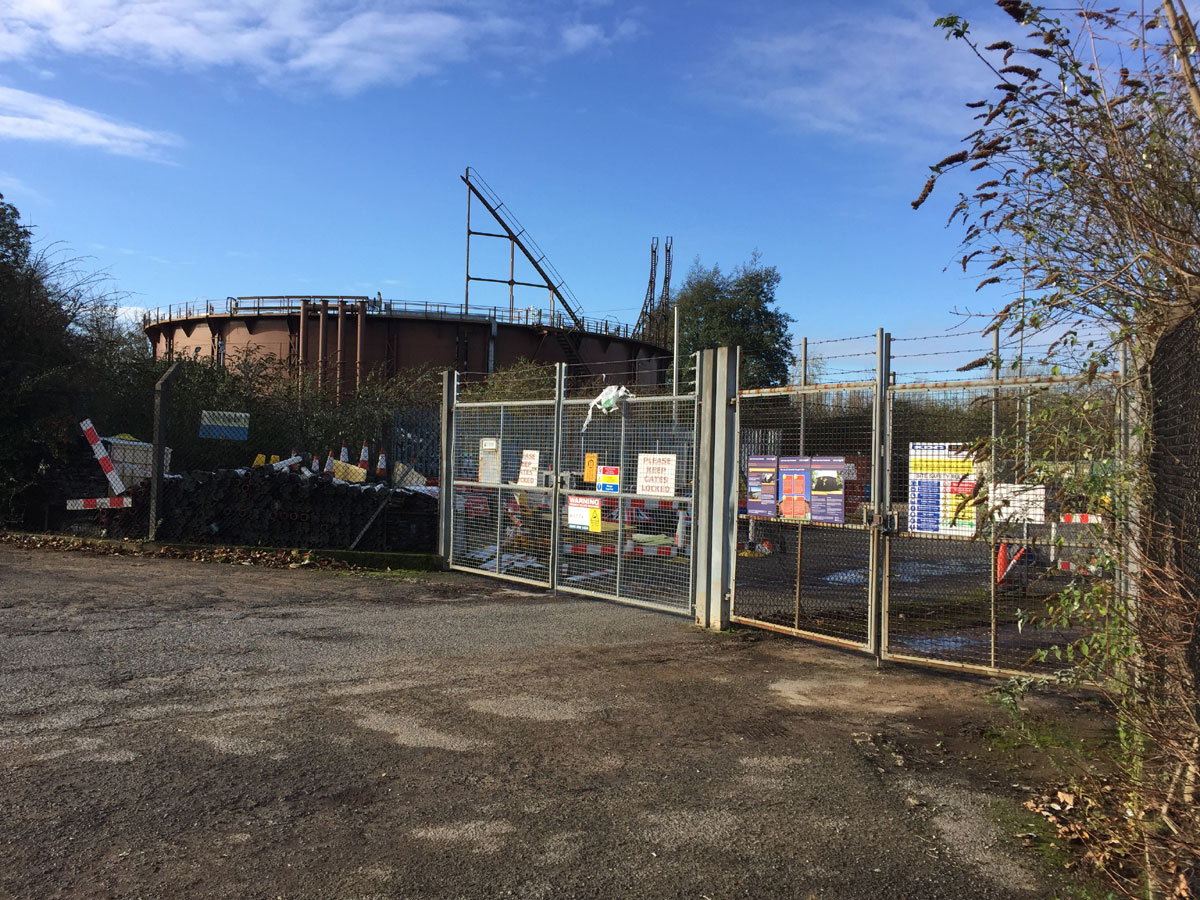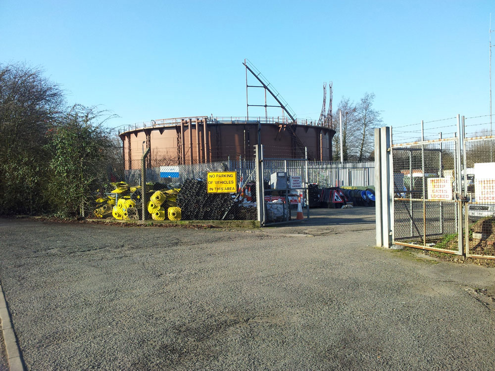 In 2011 the town gas network was being upgraded and the gasholder was no longer required for the storage of gas. It was decommissioned and purged of gas, so that the telescopic sections sank out of sight. The access ladders to the upper sections remain looking incongruous. |
