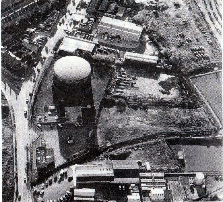 This aerial view of the Tayfen Road site shows the gas holder and general gas depot site opposite the Gas Works itself, which is out of site to the left side of the picture. |