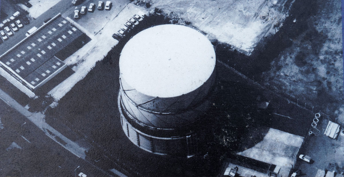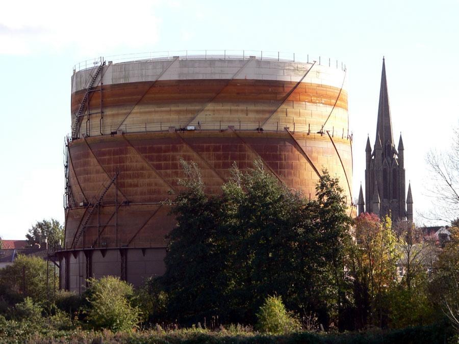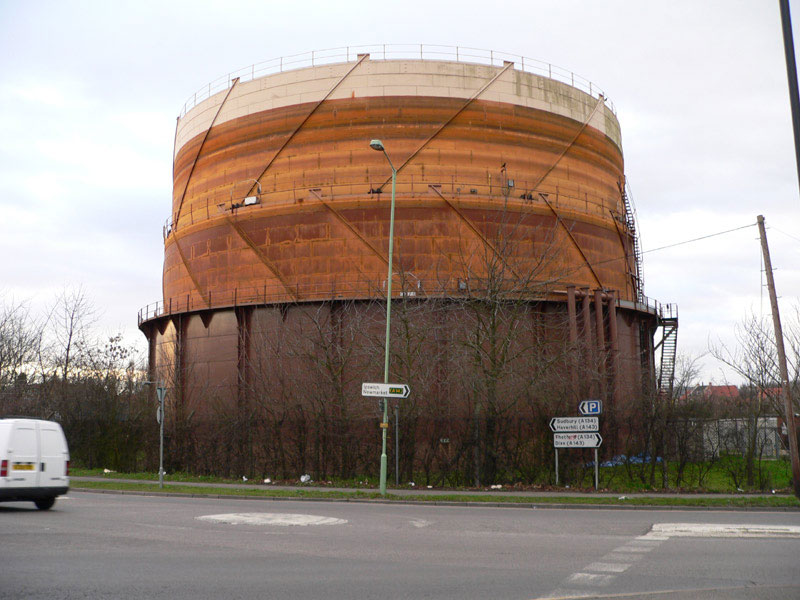 This picture shows the gasholder still in use as part of the natural gas national grid in the early years of the 21st century. It would continue in use until decommissioned in 2011. |