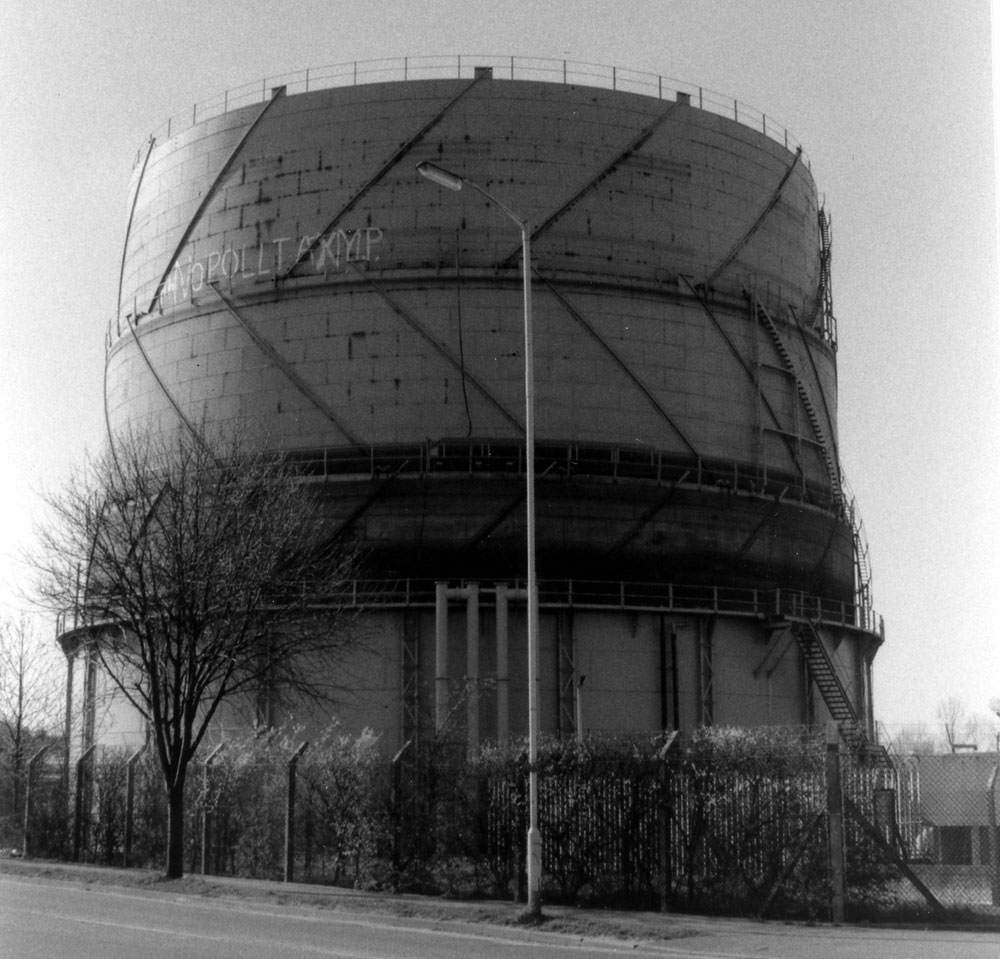 Being such a prominent landmark, the gas holder attracted a poll tax protest message in 1990. |