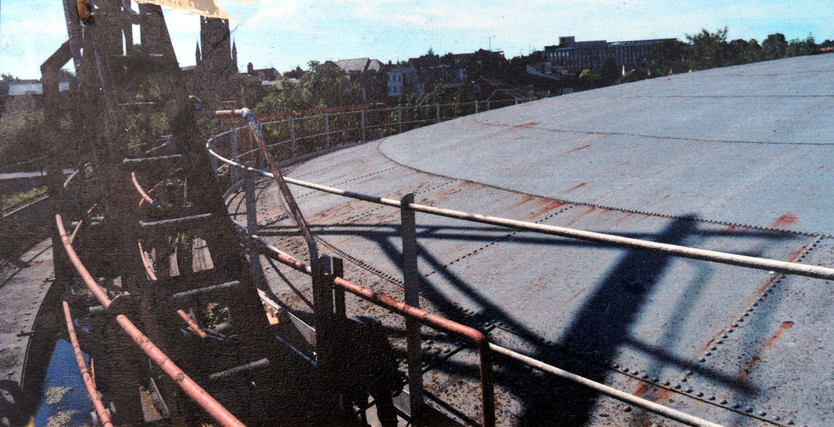 This picture shows the cap or dome of the gasholder. It had two telescopic sections which rose as the gas was manufactured and fell as it was depleted by users. The water seal which allowed this movement can just be seen on the lower left of the picture. |