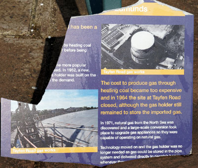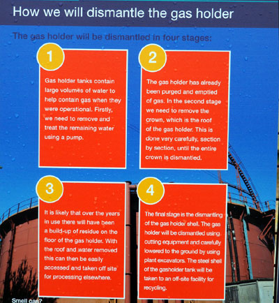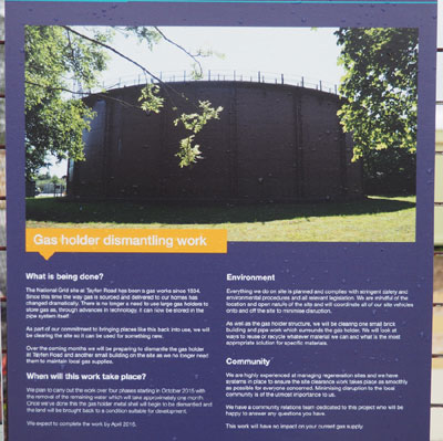 Eventually, by November, 2015, three new notices were fixed to the site gate which explained some of the history of the gasholder, and described the way in which its demolition would be carried out. Unfortunately the left hand notice was quickly vandalised and torn down. |