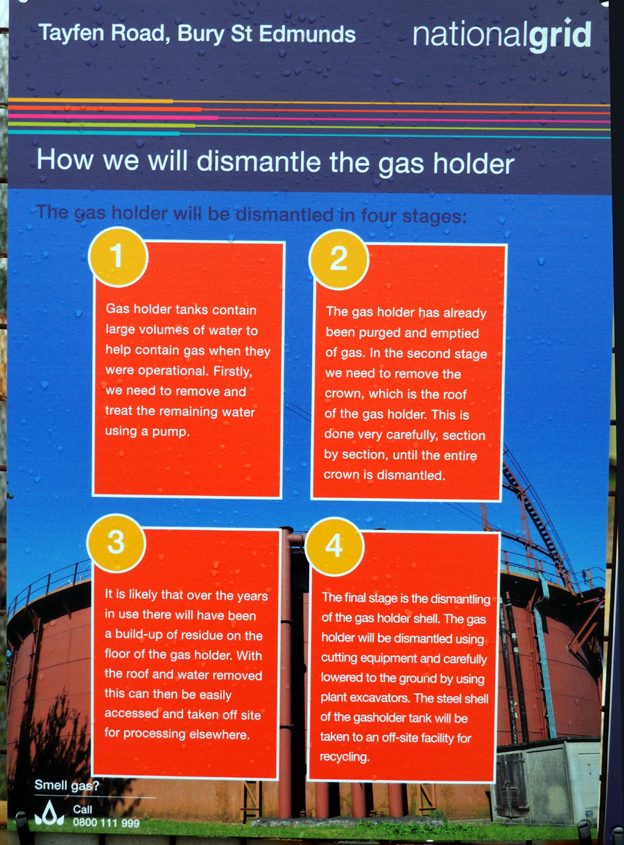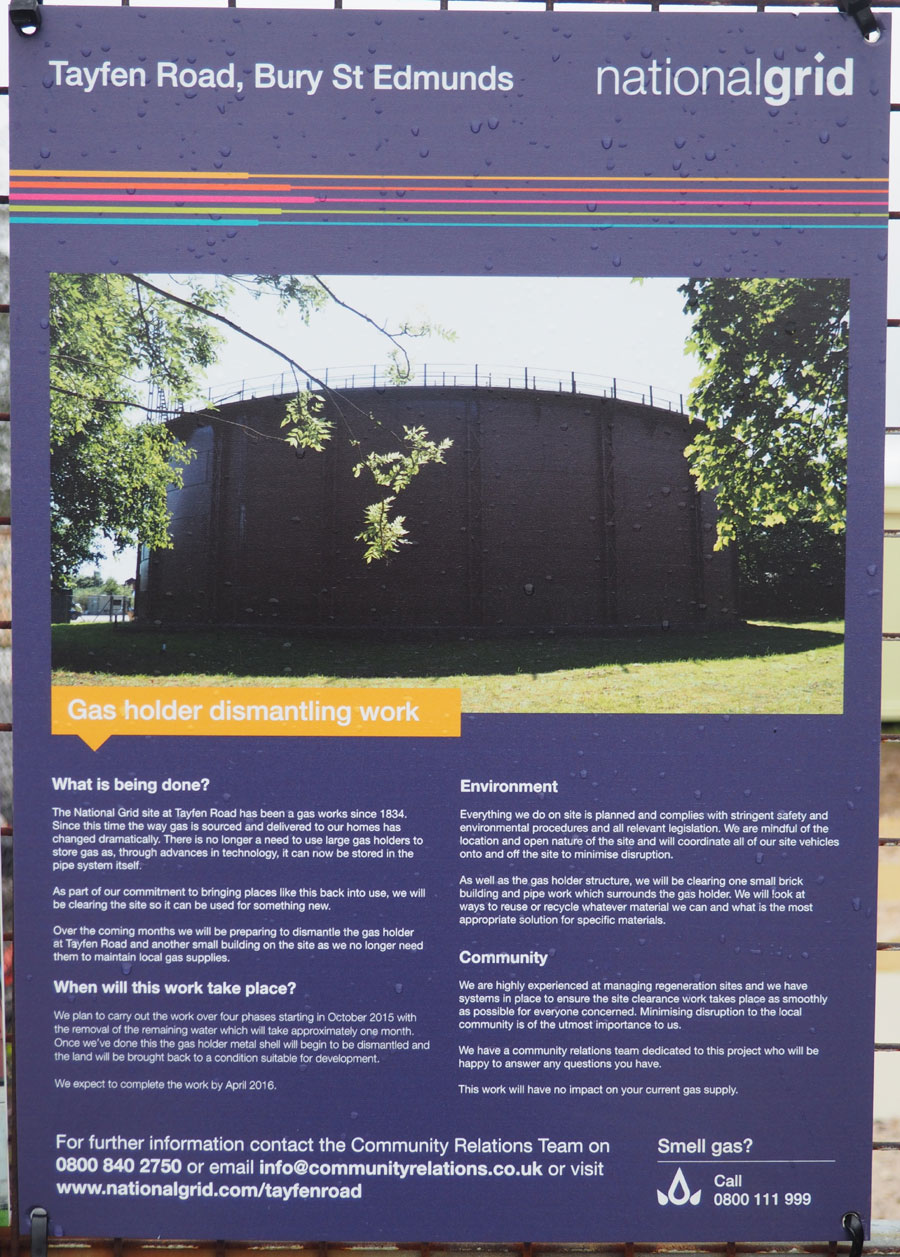 This was the first notice given of the demolition of the gasholder. In October, 2014, it was fixed to the front gate of the remaining gas depot site in Tayfen Road. Demolition was scheduled for March, 2015, but it did not in fact begin until November, 2015. |
