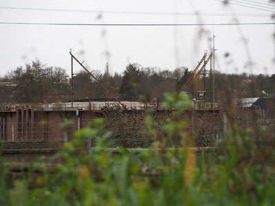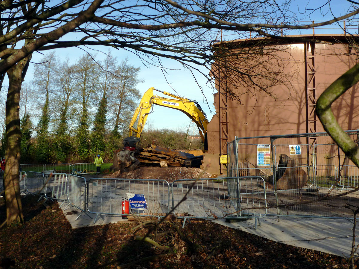 This distant view seen from the Station Hill in December, 2015, shows the cap of the gasholder in the process of removal. You will need to click on the image to see the larger version. |