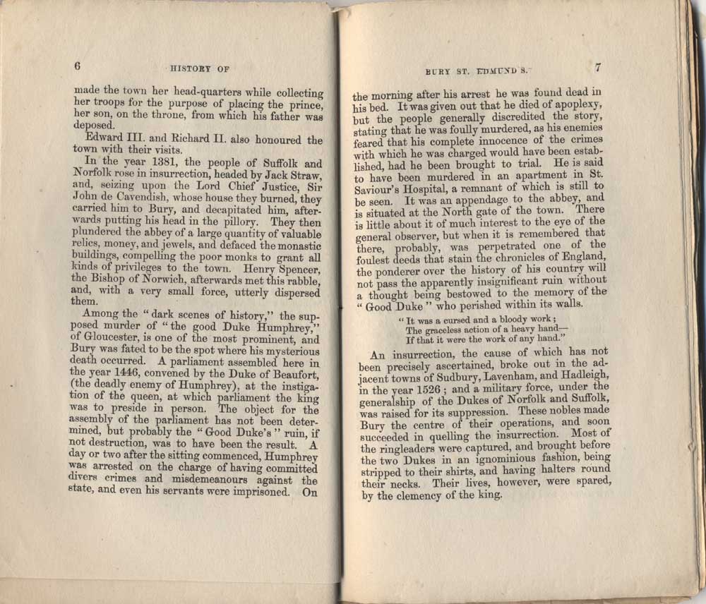 Pages 6 and 7 covers Peasants Revolt, death of Duke Humphrey, Sudbury revolt 1526. |