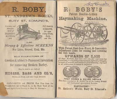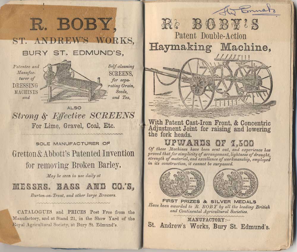 Pages b and c with Robert Boby's two page advertisement. Note the haymaker on the page following J L Butt's competitor machine. |